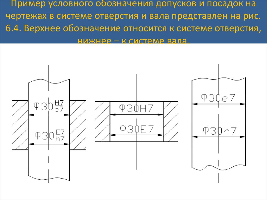 Пример условного обозначения допусков и посадок начертежах в системе отверстия и вала представлен на рис.