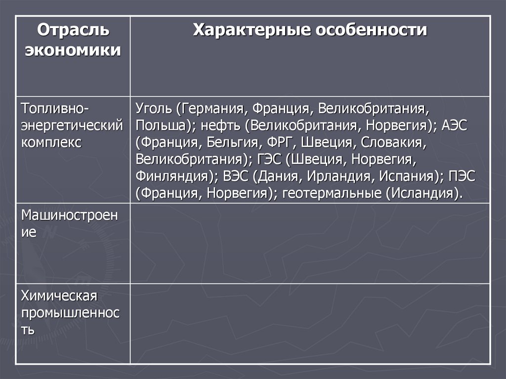 энергетический Польша); нефть (Великобритания, Норвегия); АЭС