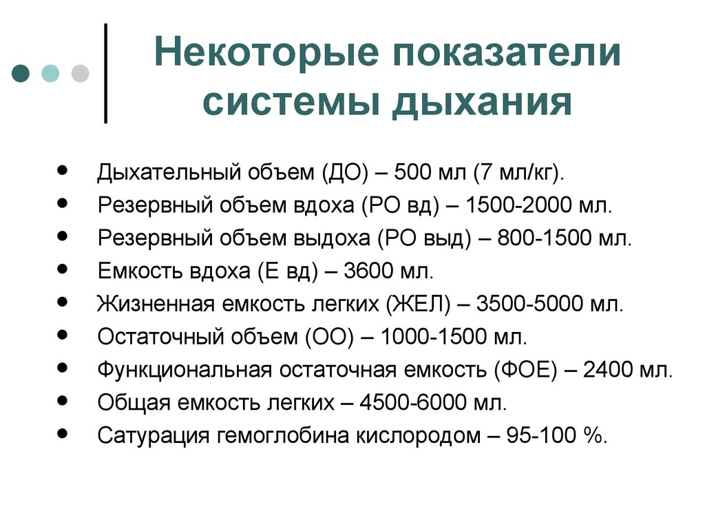 Дыхательный объем (ДО) – 500 мл (7 мл/кг).Резервный объем вдоха (РО вд) – 1500-2000 мл.