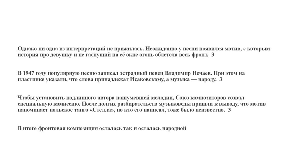 пластинке указали, что слова принадлежат Исаковскому, а музыка — народу. 3