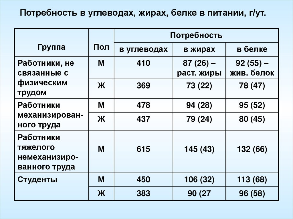 Потребность в углеводах, жирах, белке в питании, г/ут.Потребность