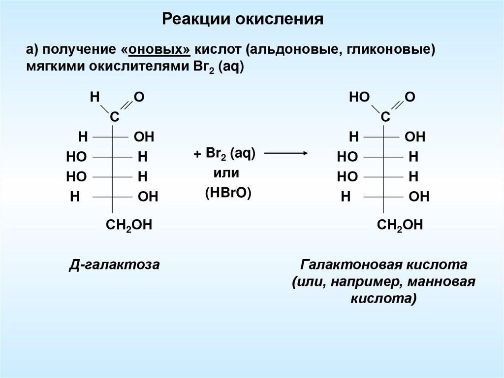 Реакции окисленияа) получение «оновых» кислот (альдоновые, гликоновые)