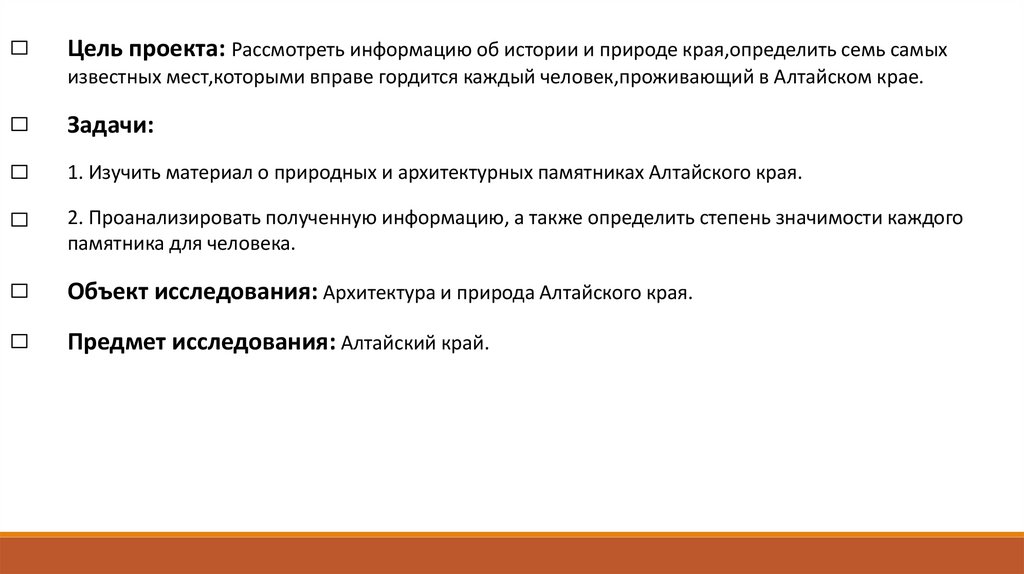 Цель проекта: Рассмотреть информацию об истории и природе края,определить семь самыхизвестных мест,которыми вправе гордится каждый человек,проживающий в Алтайском крае.