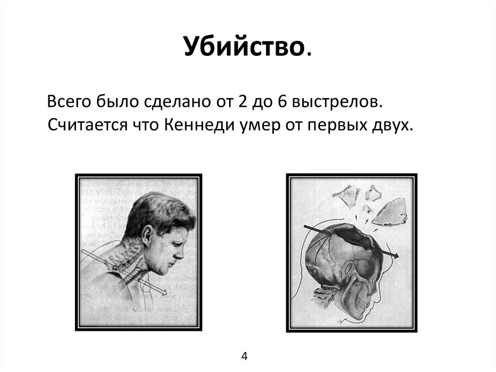 Всего было сделано от 2 до 6 выстрелов.Считается что Кеннеди умер от первых двух.