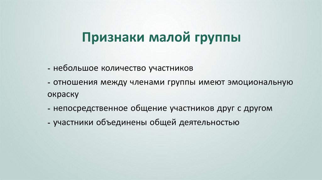 Малая группа представляет собой объединение людей – от двух-трёх(например, семья, круг ближайших друзей) до 20-30 человек (например,