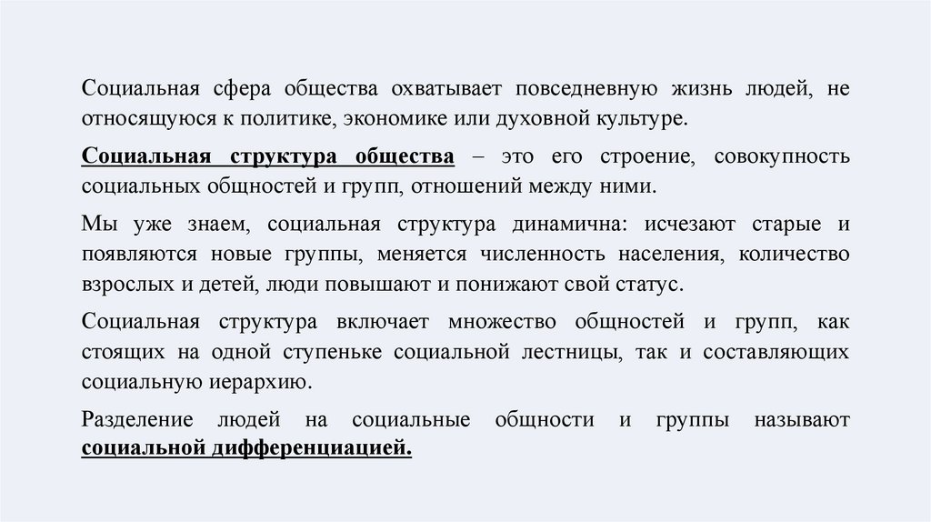 Социальная сфера общества охватывает повседневную жизнь людей, неотносящуюся к политике, экономике или духовной культуре.