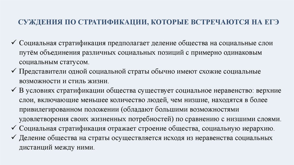 СУЖДЕНИЯ ПО СТРАТИФИКАЦИИ, КОТОРЫЕ ВСТРЕЧАЮТСЯ НА ЕГЭСоциальная стратификация предполагает деление общества на социальные слои