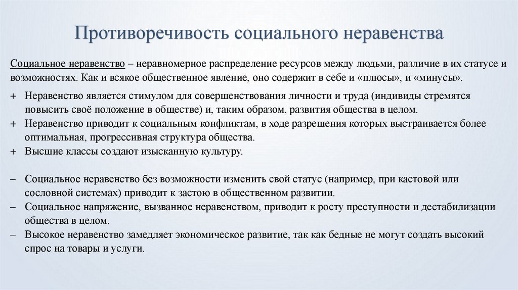 Противоречивость социального неравенстваСоциальное неравенство – неравномерное распределение ресурсов между людьми, различие в их статусе и