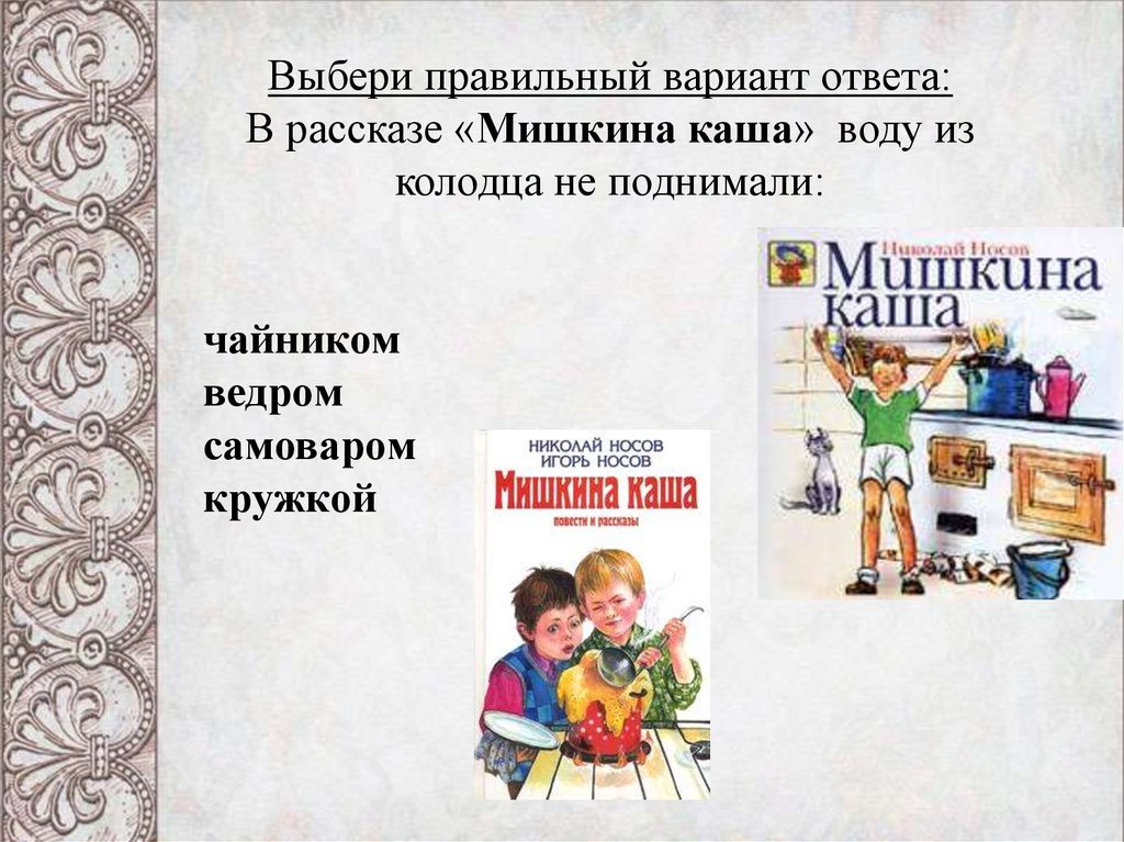 Выбери правильный вариант ответа:В рассказе «Мишкина каша» воду из
