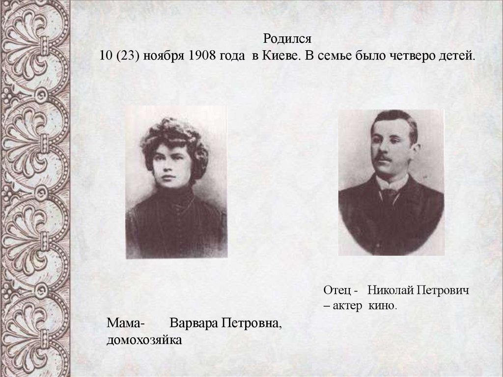Родился10 (23) ноября 1908 года в Киеве. В семье было четверо детей.