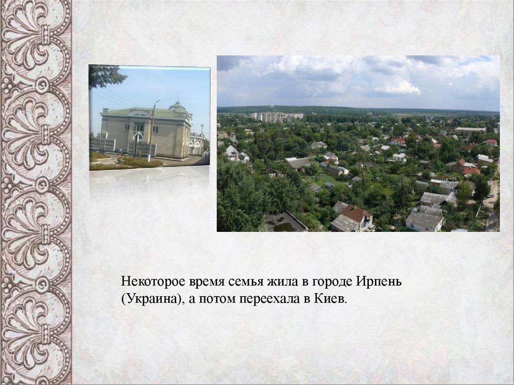 Некоторое время семья жила в городе Ирпень(Украина), а потом переехала в Киев.