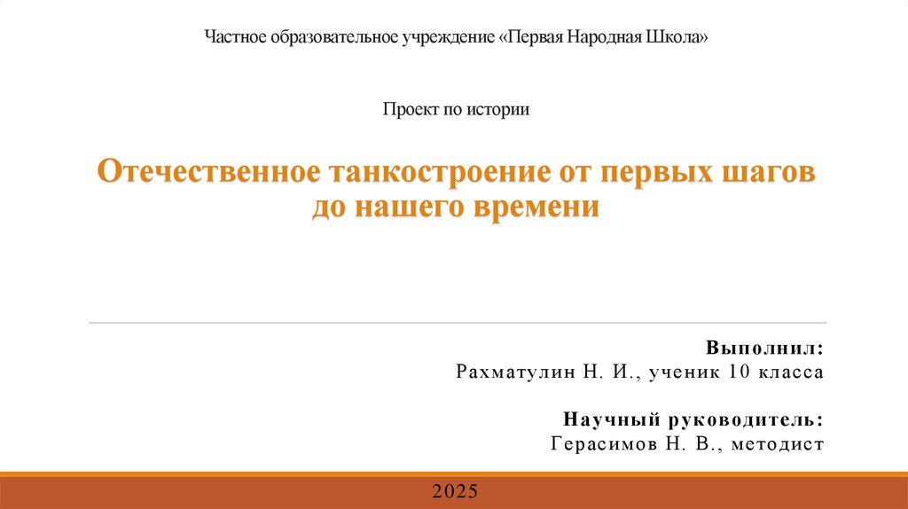1. Частное образовательное учреждение «Первая Народная Школа» Проект по истории Отечественное танкостроение от первых шагов до