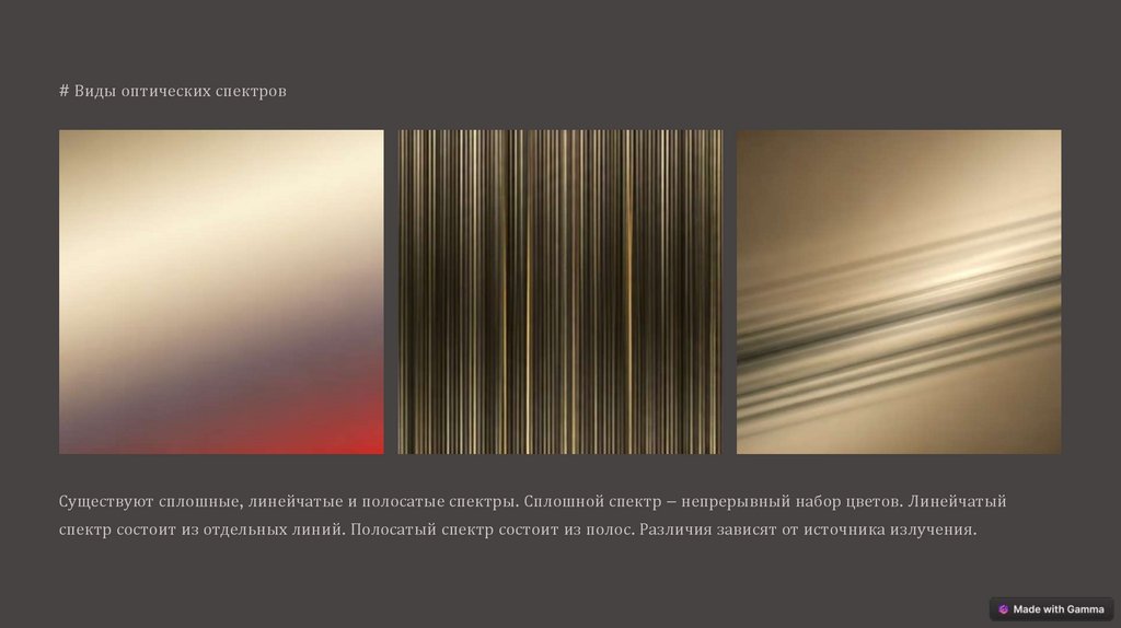 # Виды оптических спектровСуществуют сплошные, линейчатые и полосатые спектры. Сплошной спектр – непрерывный набор цветов. Линейчатый