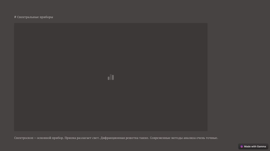 # Спектральные приборыСпектроскоп – основной прибор. Призма разлагает свет. Дифракционная решетка также. Современные методы анализа очень точные.