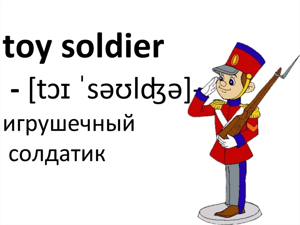 toy soldier- [tɔɪ ˈsəʊlʤə]игрушечный