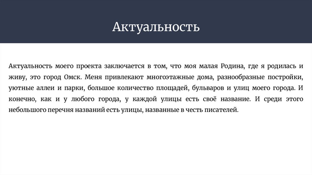 Актуальность моего проекта заключается в том, что моя малая Родина, где я родилась иживу, это город Омск. Меня привлекают многоэтажные дома, разнообразные постройки,