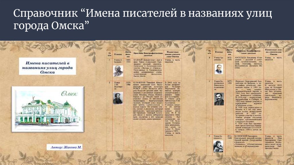 справочника «Имена писателей в названиях улиц города Омска» в виде таблицы,