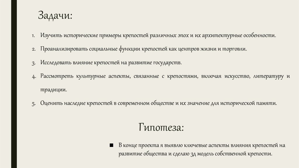 Задачи:1. Изучить исторические примеры крепостей различных эпох и их архитектурные особенности.