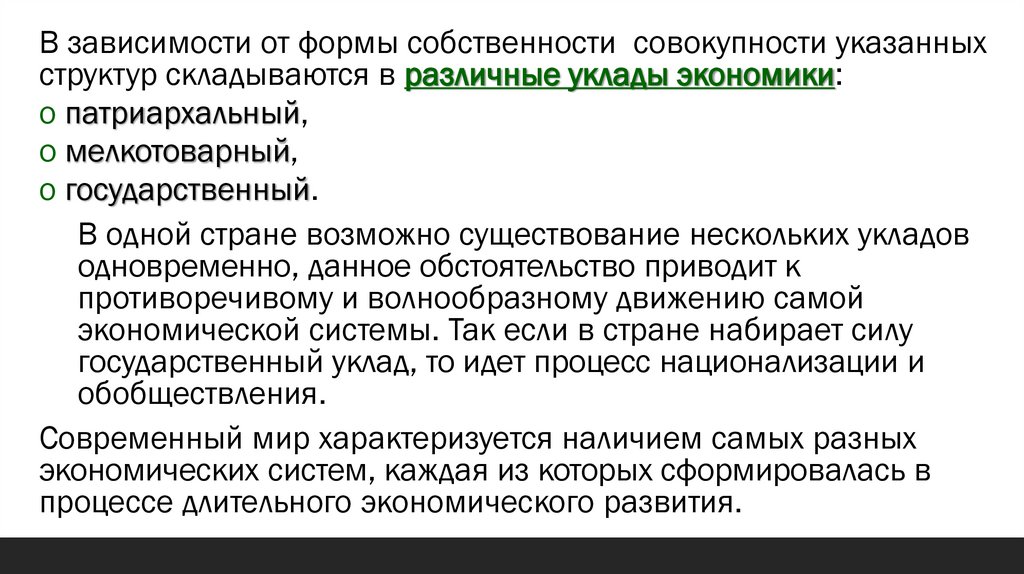 В зависимости от формы собственности совокупности указанныхструктур складываются в различные уклады экономики:
