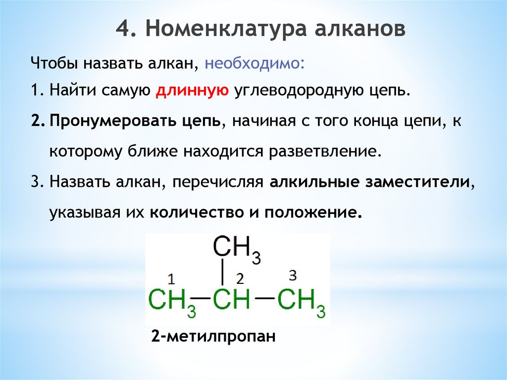 4. Номенклатура алкановЧтобы назвать алкан, необходимо: