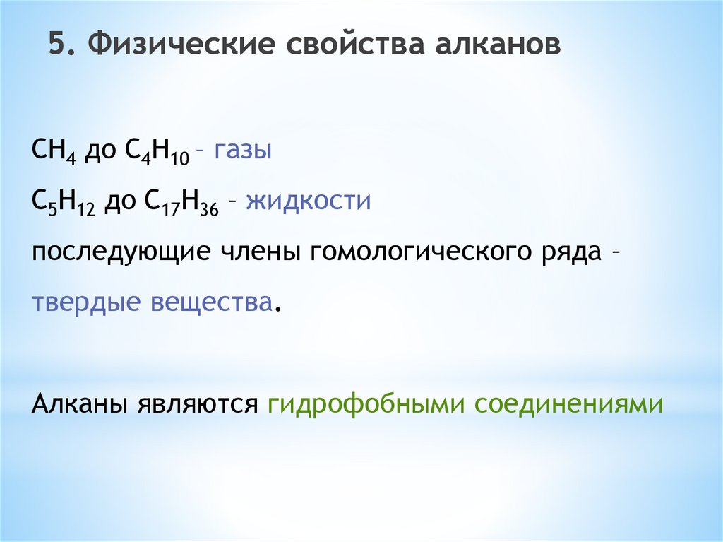 5. Физические свойства алкановСН4 до С4Н10 – газы