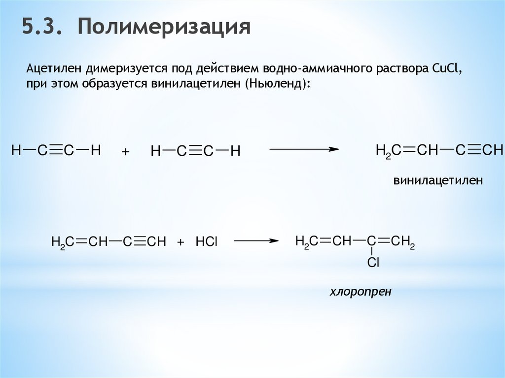 5.3. ПолимеризацияАцетилен димеризуется под действием водно-аммиачного раствора CuCl,