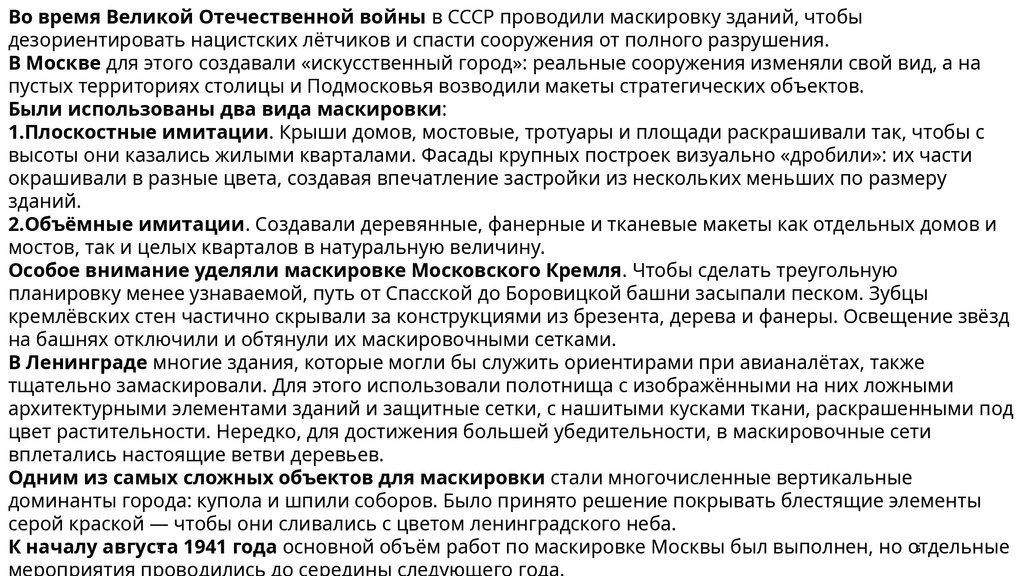Во время Великой Отечественной войны в СССР проводили маскировку зданий, чтобыдезориентировать нацистских лётчиков и спасти сооружения от полного разрушения.