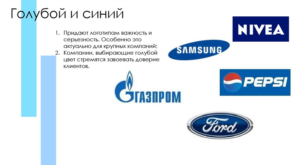 Голубой и синий1. Придают логотипам важность и
