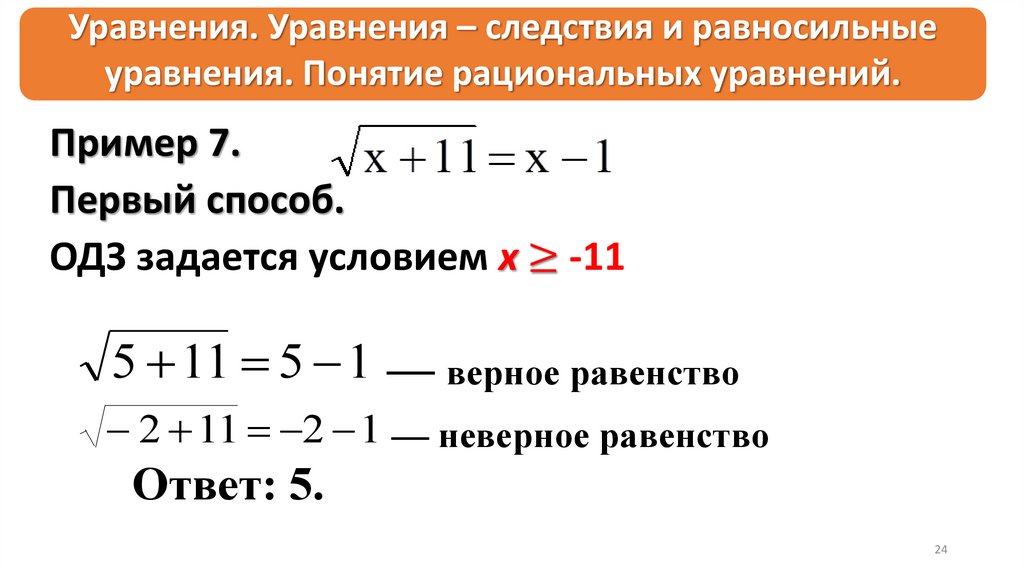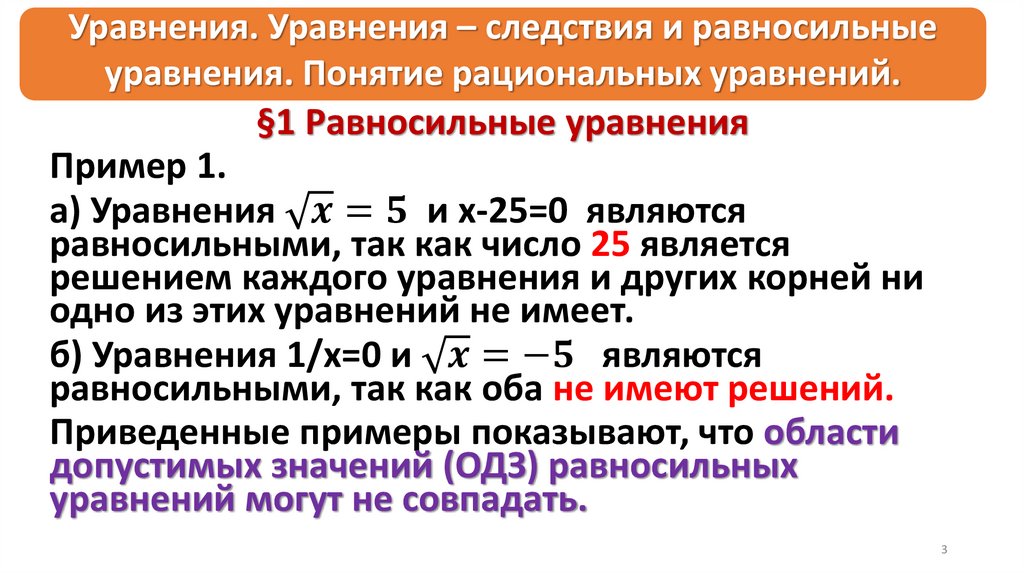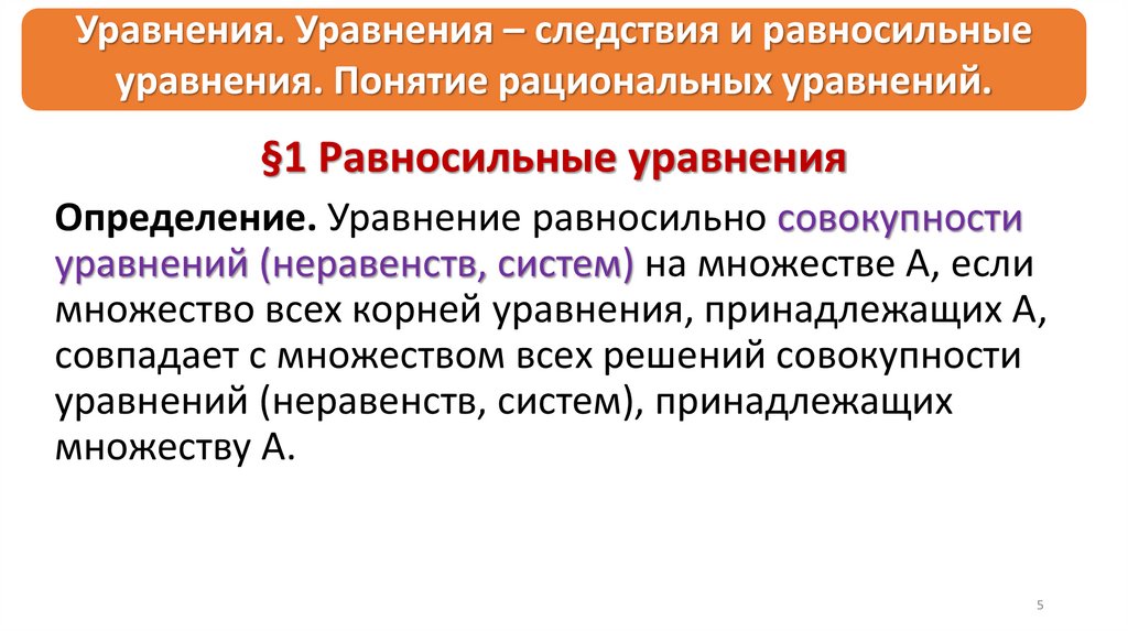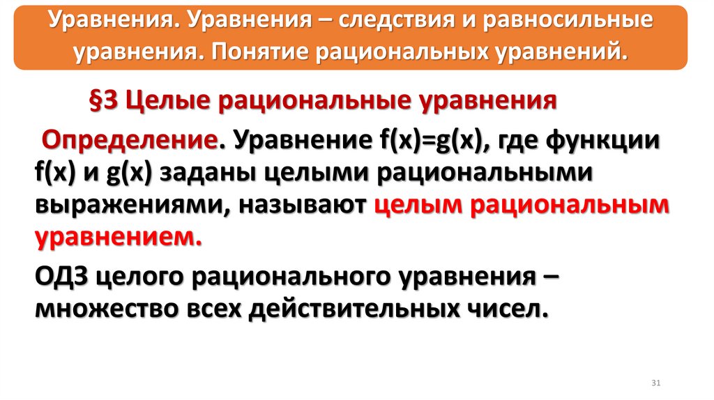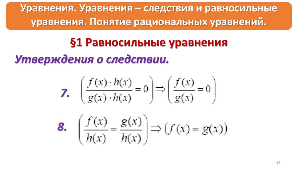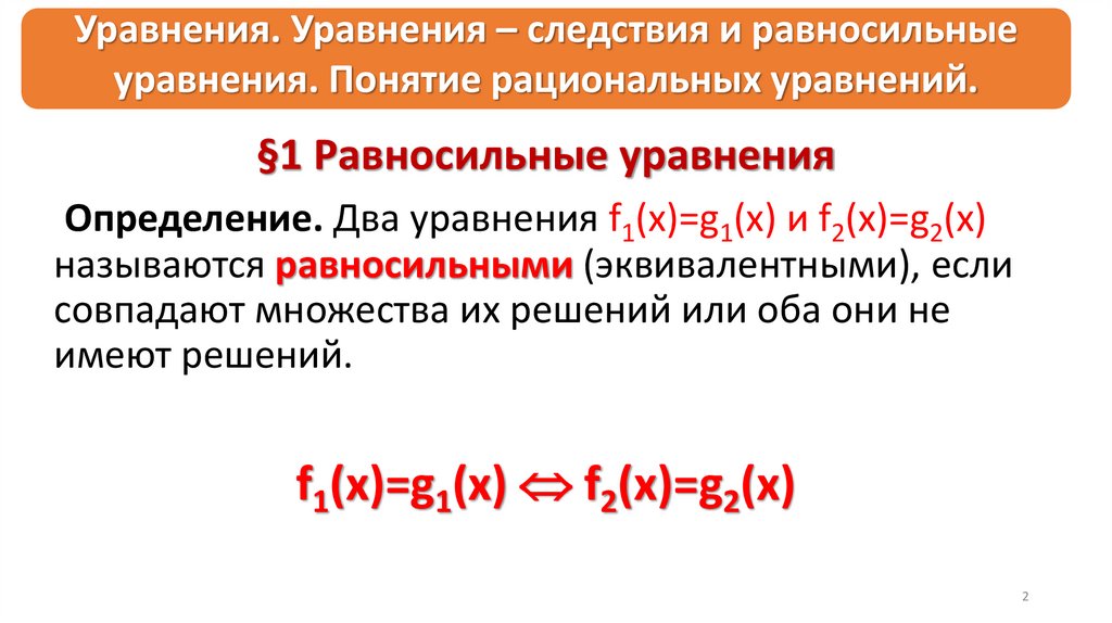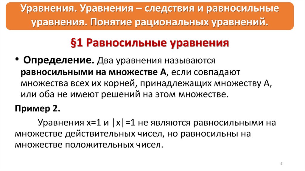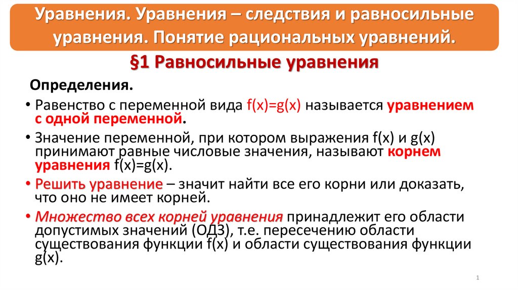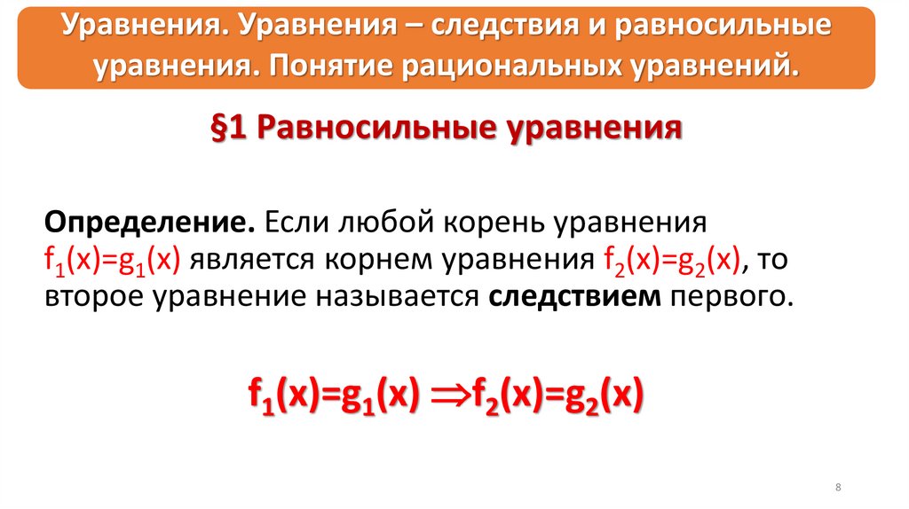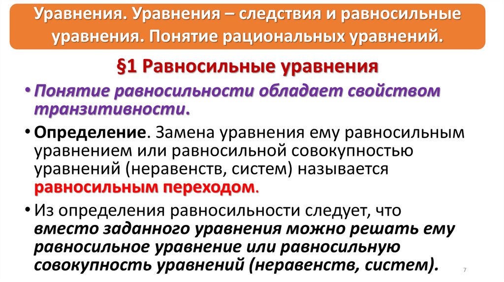 Уравнения. Уравнения – следствия и равносильныеуравнения. Понятие рациональных уравнений.