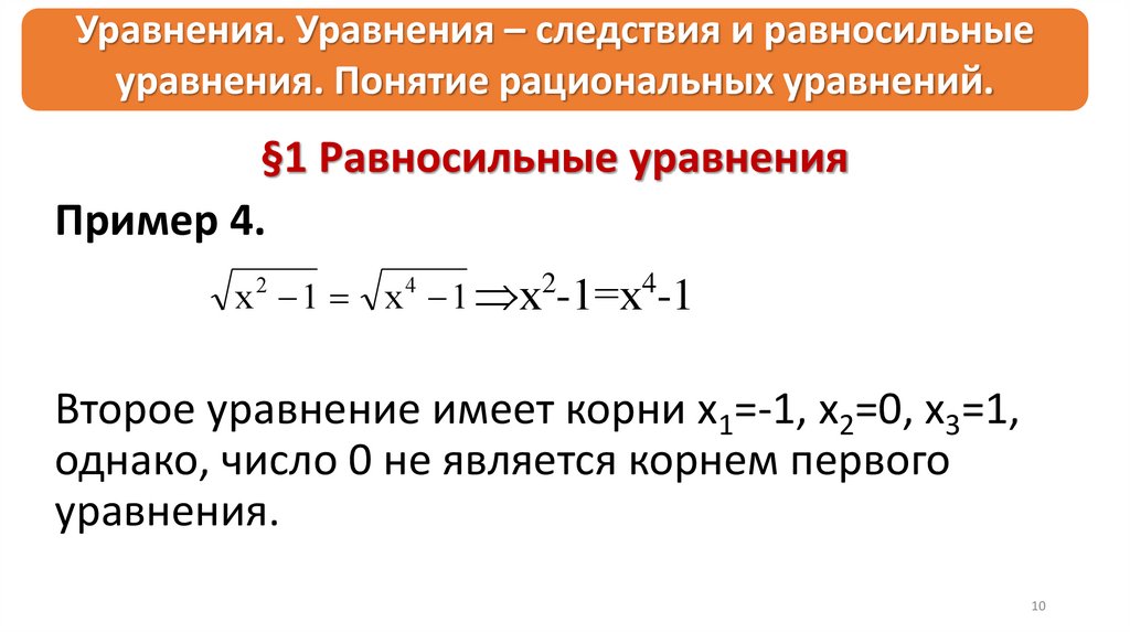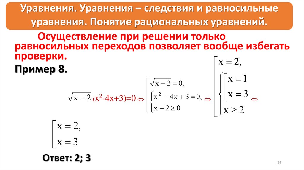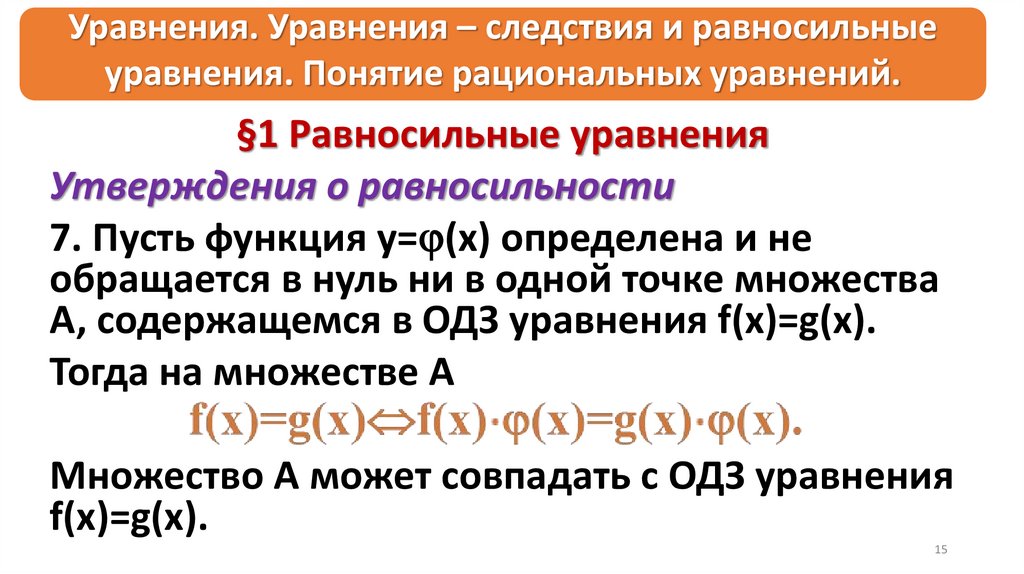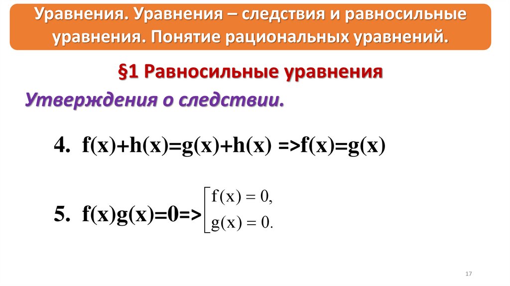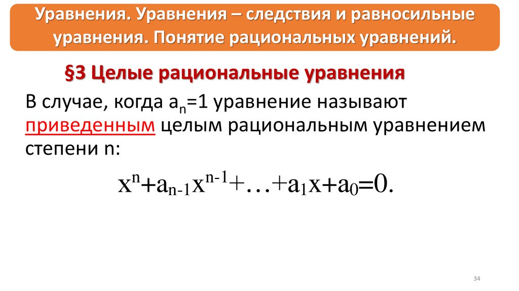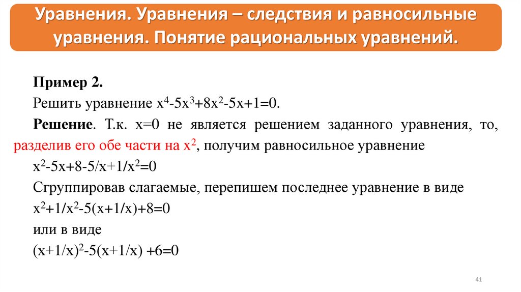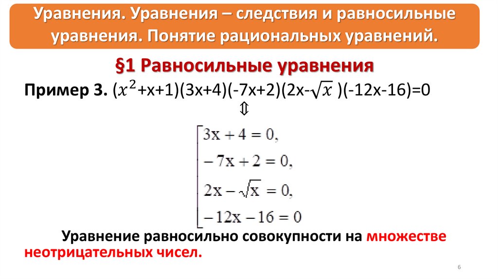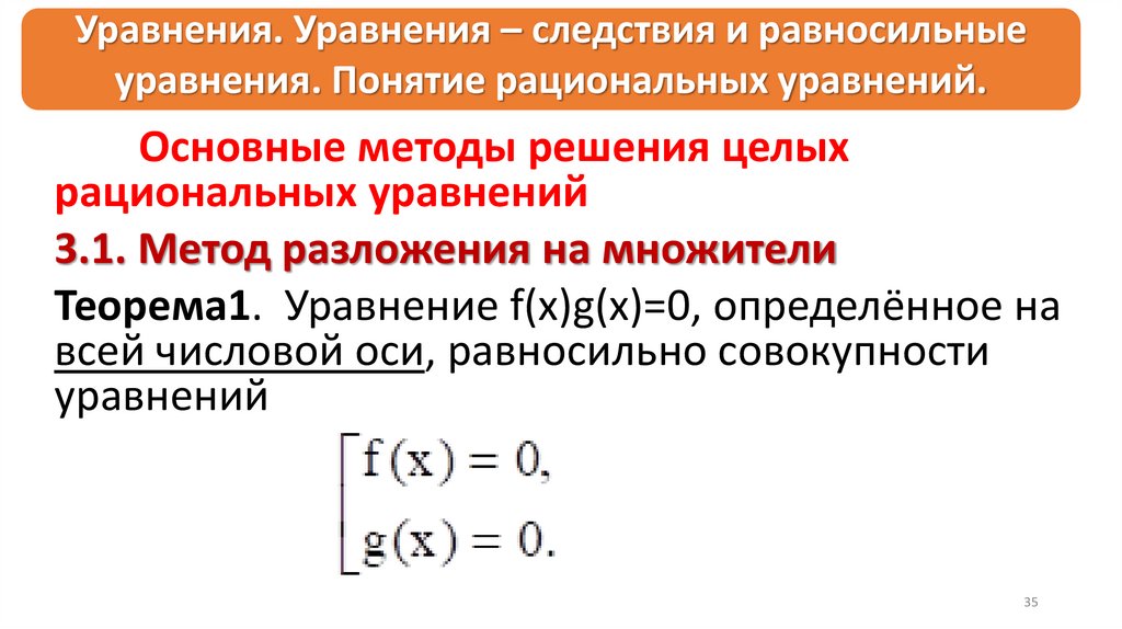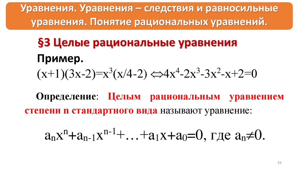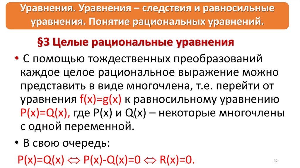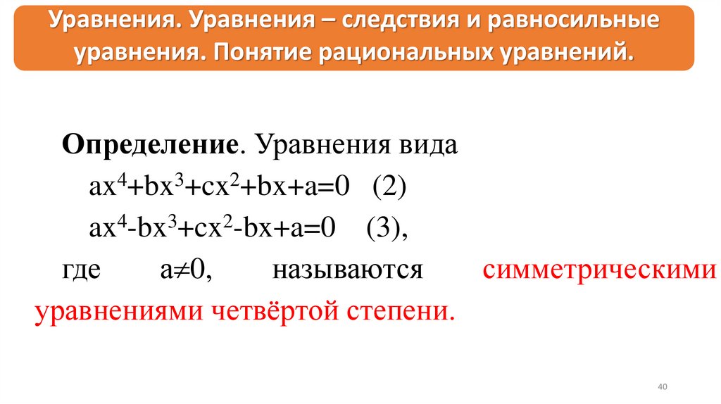 Уравнения. Уравнения – следствия и равносильныеуравнения. Понятие рациональных уравнений.
