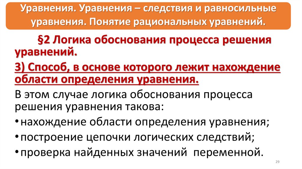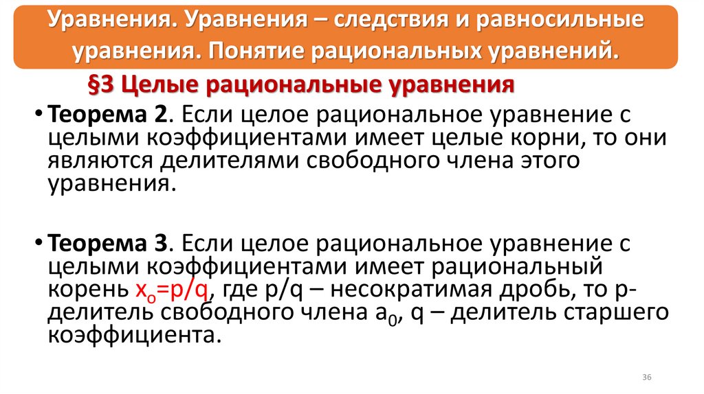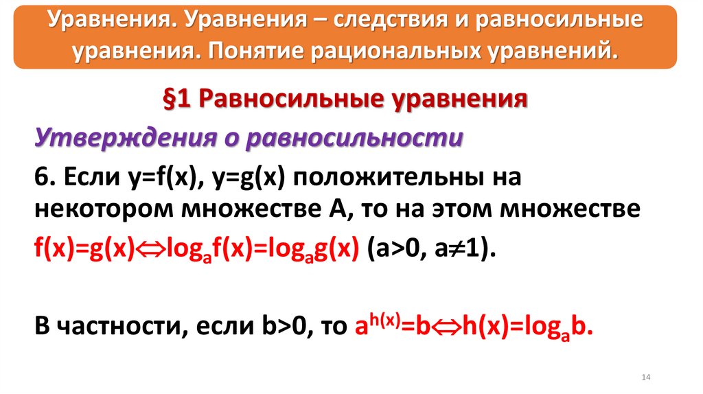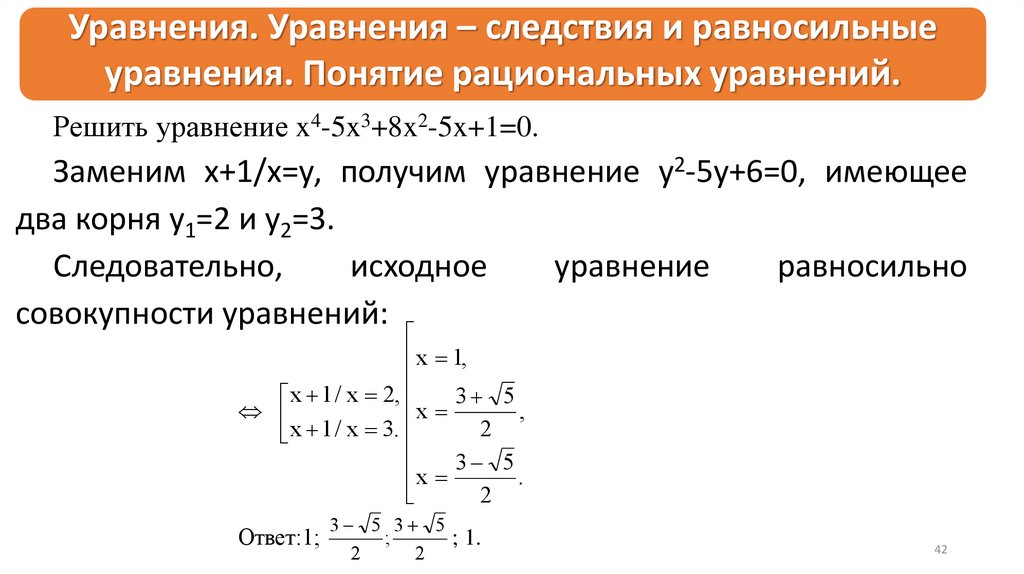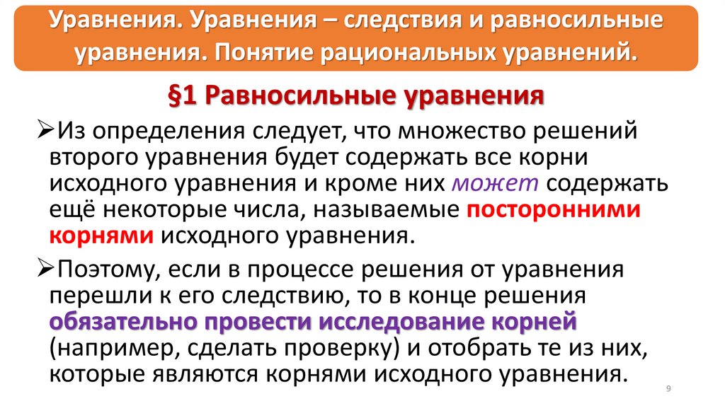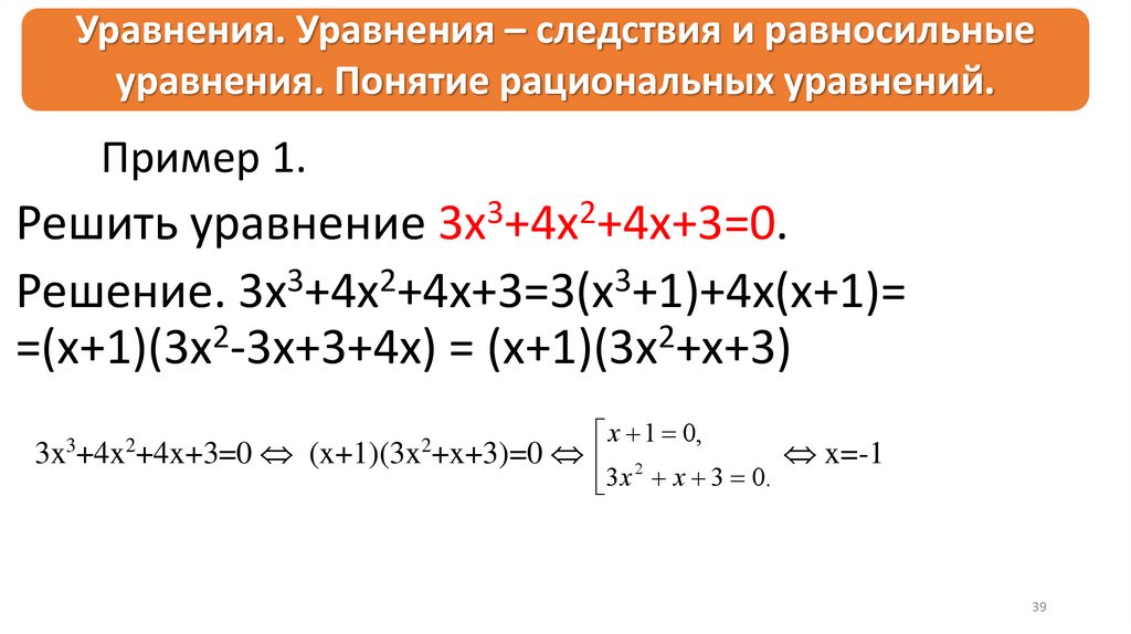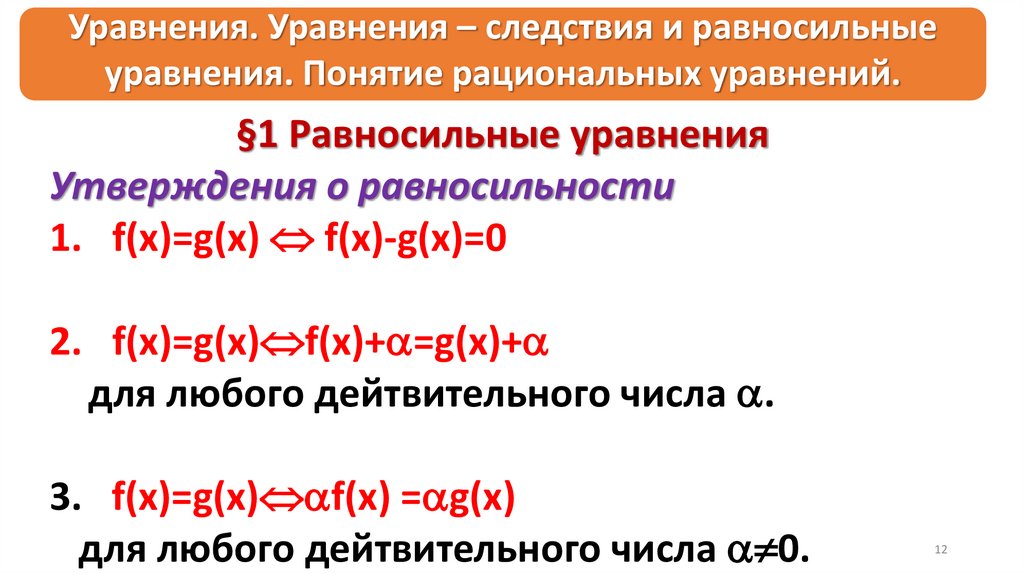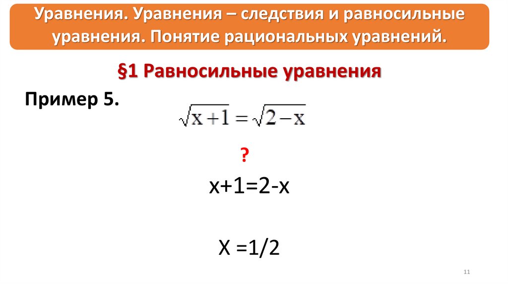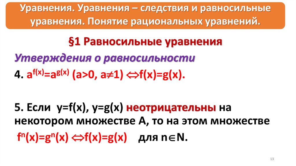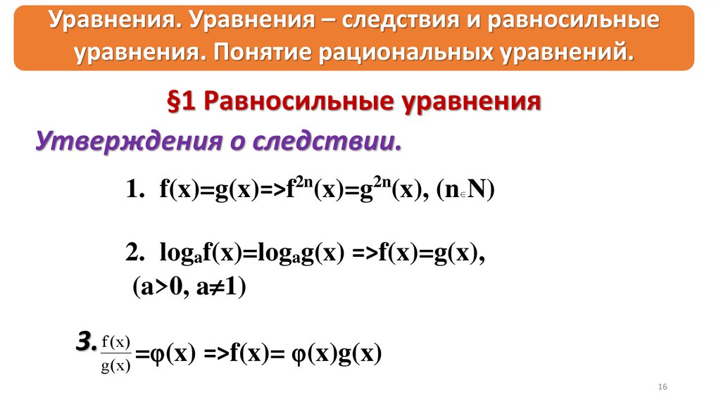Уравнения. Уравнения – следствия и равносильныеуравнения. Понятие рациональных уравнений.