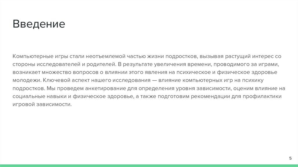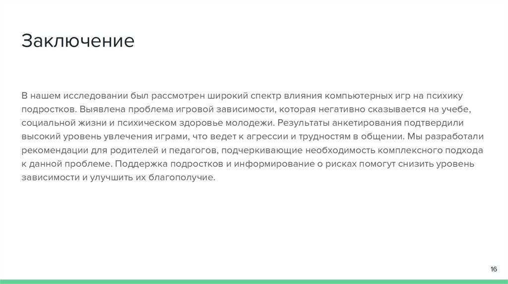 ЗаключениеВ нашем исследовании был рассмотрен широкий спектр влияния компьютерных игр на психику
