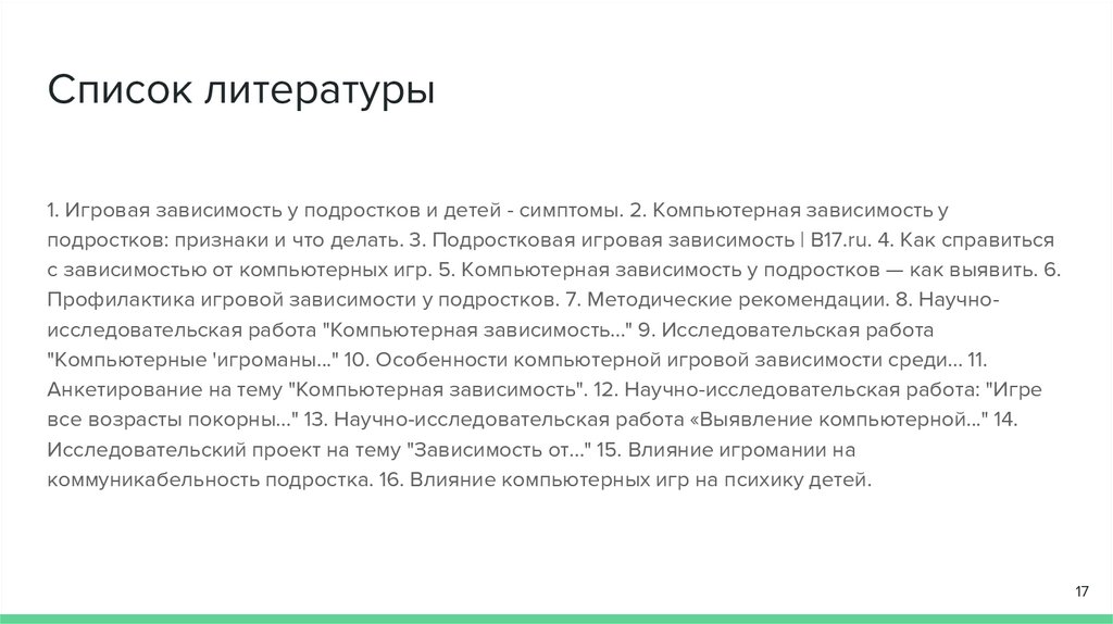 Список литературы1. Игровая зависимость у подростков и детей - симптомы. 2. Компьютерная зависимость у