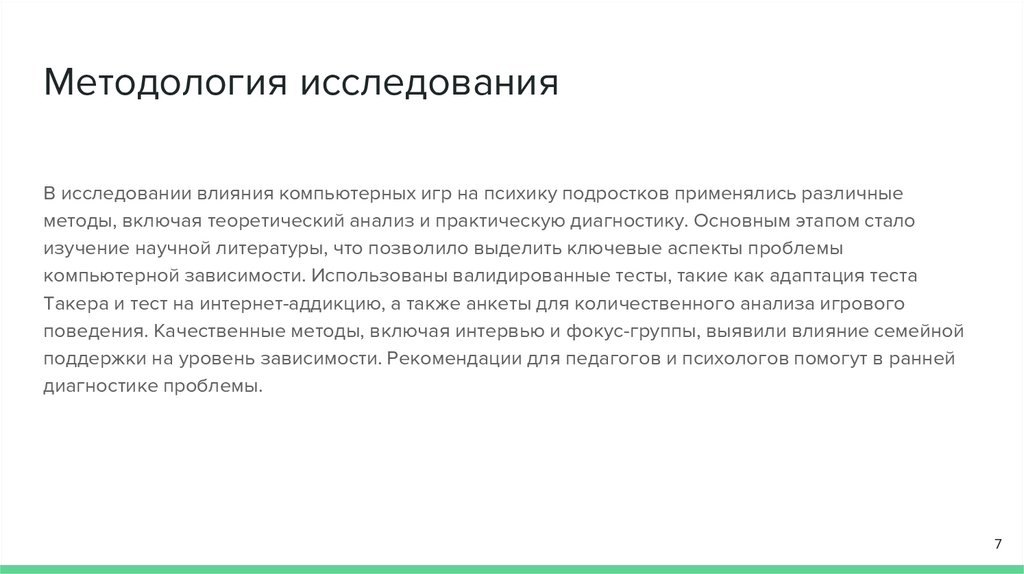 Методология исследованияВ исследовании влияния компьютерных игр на психику подростков применялись различные