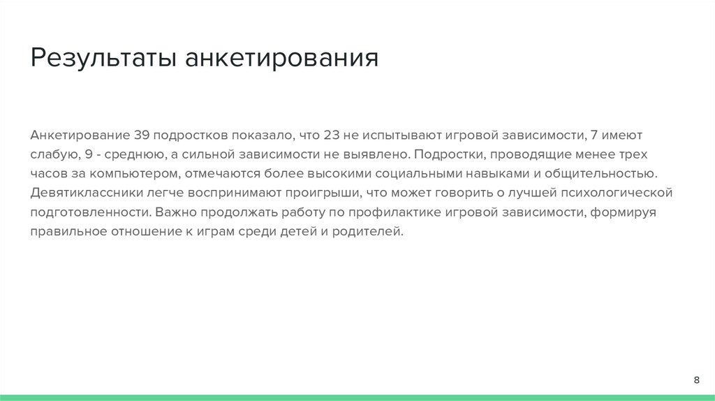 Результаты анкетированияАнкетирование 39 подростков показало, что 23 не испытывают игровой зависимости, 7 имеют