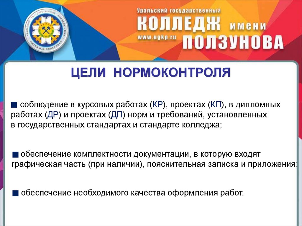 ЦЕЛИ НОРМОКОНТРОЛЯсоблюдение в курсовых работах (КР), проектах (КП), в дипломных
