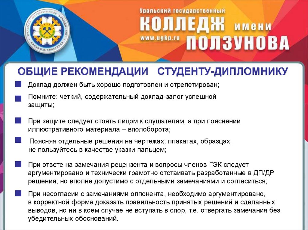 ОБЩИЕ РЕКОМЕНДАЦИИ СТУДЕНТУ-ДИПЛОМНИКУДоклад должен быть хорошо подготовлен и отрепетирован;