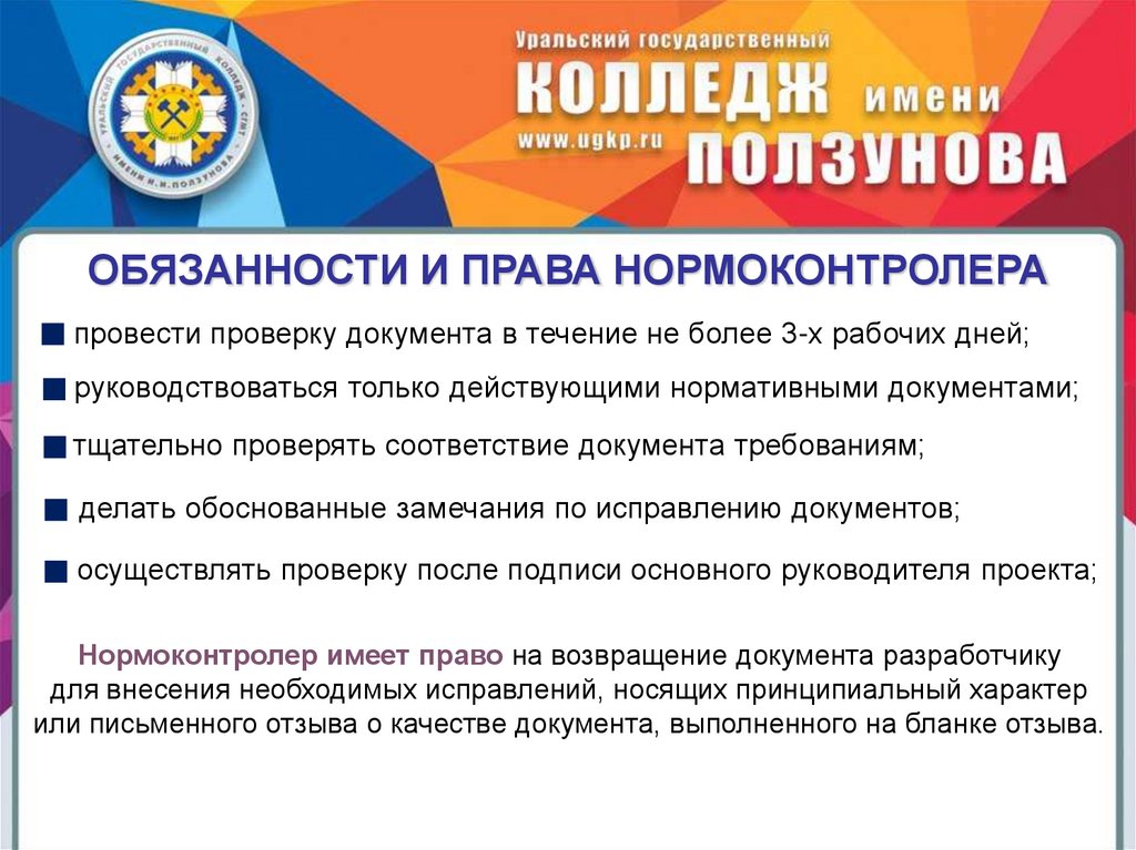 ОБЯЗАННОСТИ И ПРАВА НОРМОКОНТРОЛЕРАпровести проверку документа в течение не более 3-х рабочих дней;