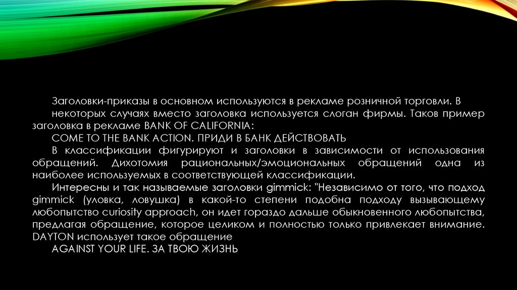 ЗАГОЛОВОКЗаголовок - самая важная вербальная часть рекламы. Обычно в нем