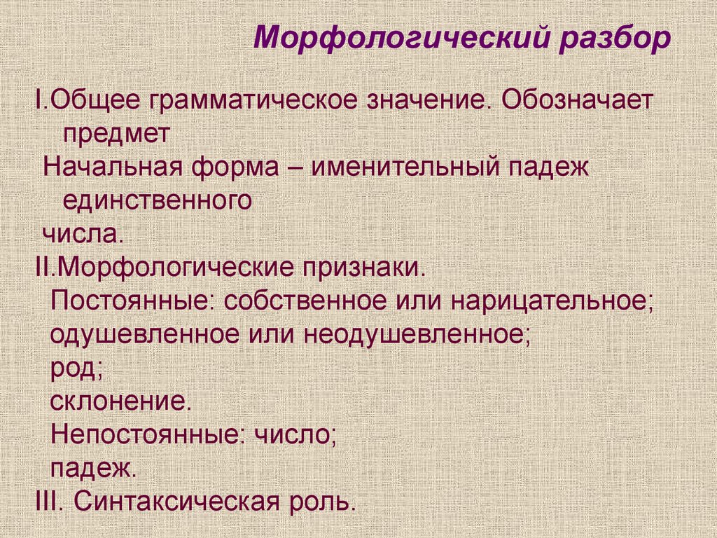 Морфологический разборI.Общее грамматическое значение. Обозначает