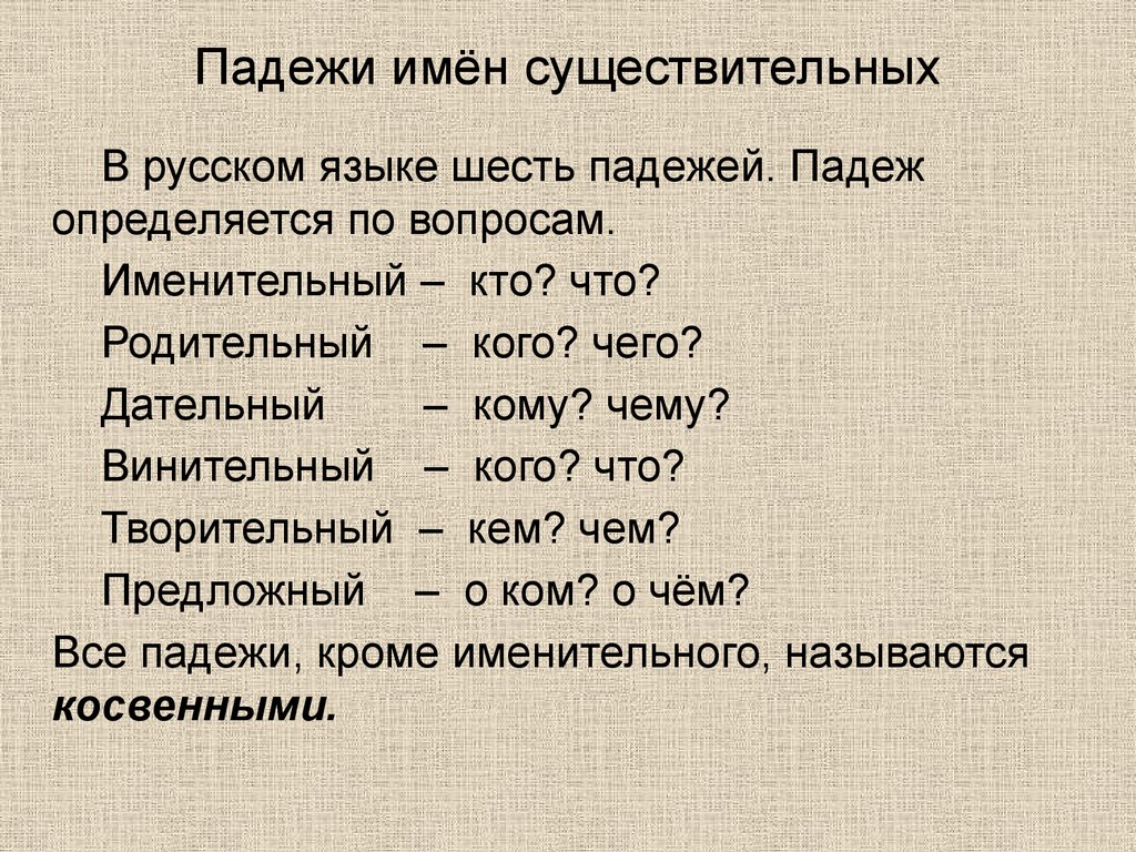 Падежи имён существительныхВ русском языке шесть падежей. Падеж