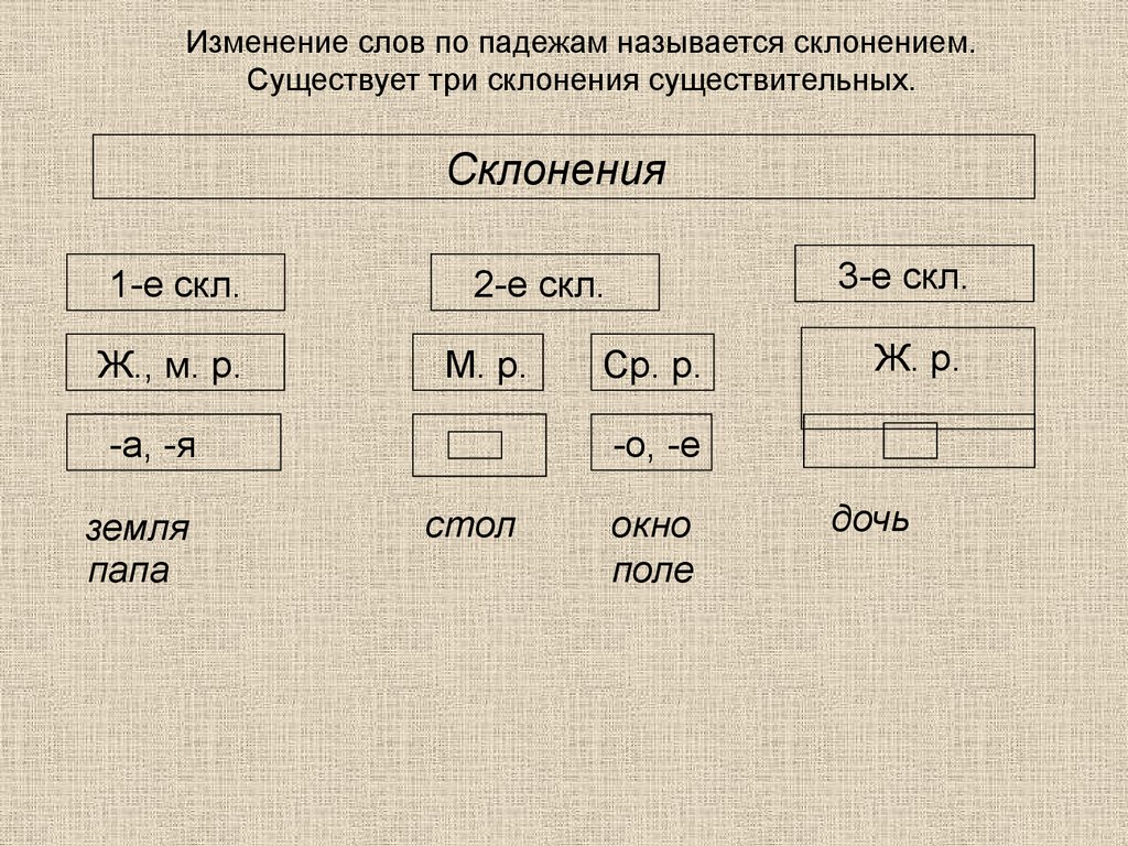 Изменение слов по падежам называется склонением.Существует три склонения существительных.