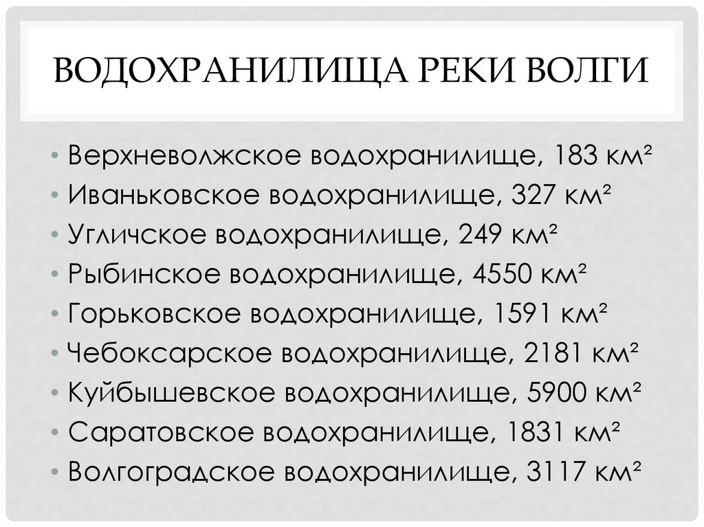 ВОДОХРАНИЛИЩА РЕКИ ВОЛГИ• Верхневолжское водохранилище, 183 км²
