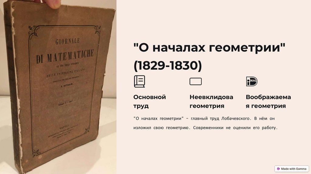 "О началах геометрии" – главный труд Лобачевского. В нём он