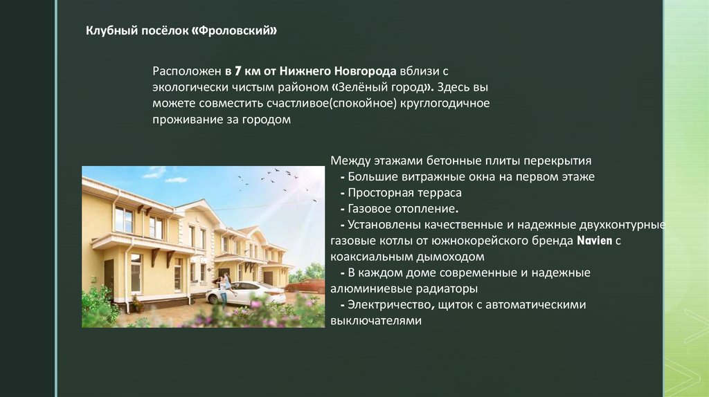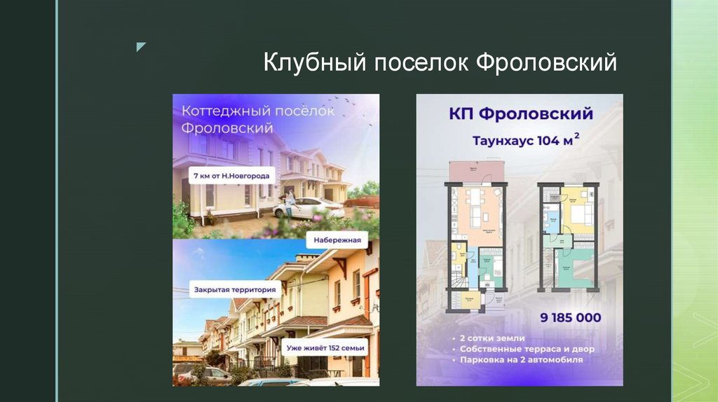 Клубный посёлок «Фроловский»Расположен в 7 км от Нижнего Новгорода вблизи с