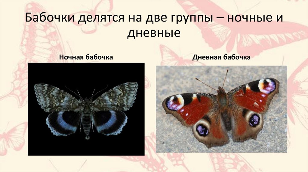 Днём отдыхают, а ночью летают. Они отличаются от дневныхбабочек особенностями строения: тело у них более толстое, а