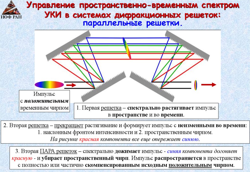 3. Вторая ПАРА решеток – спектрально дожимает импульс - синяя компонента догоняет