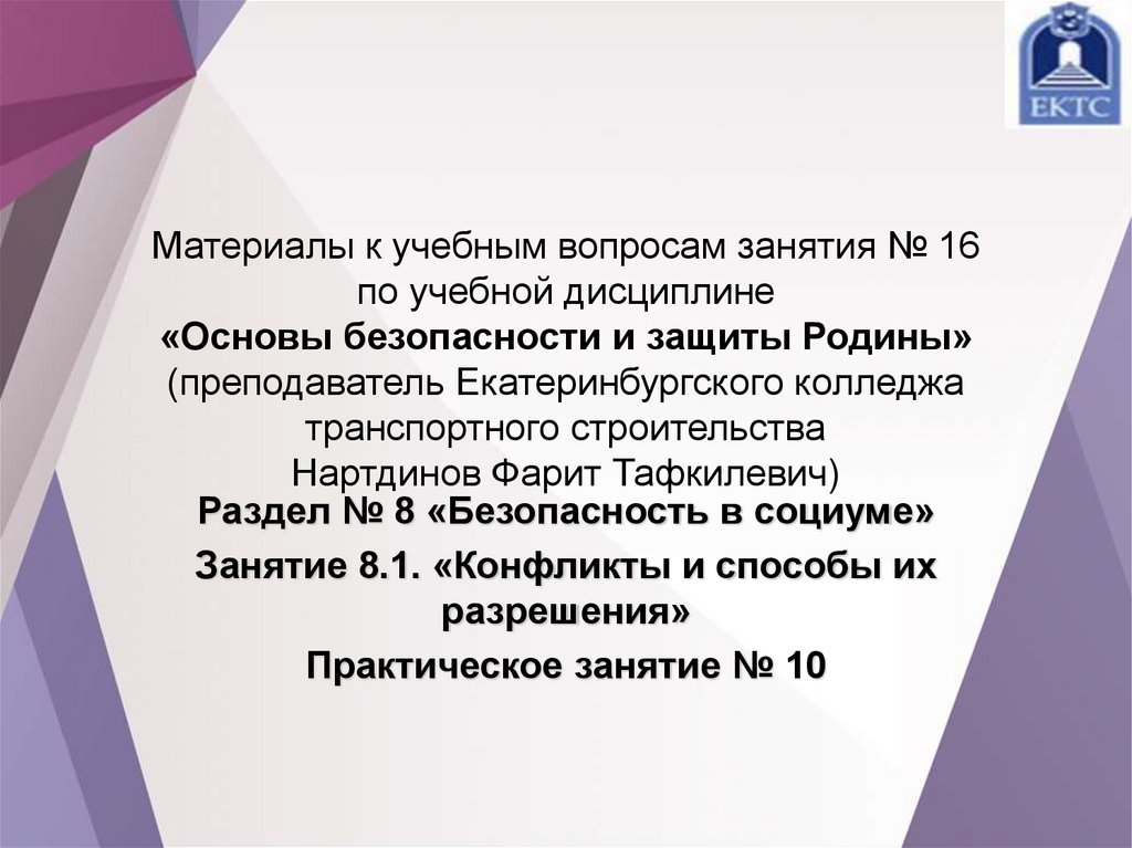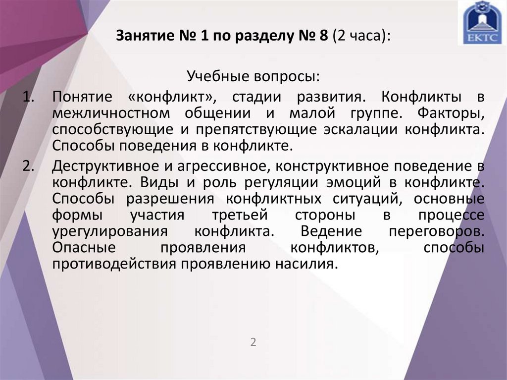 Занятие № 1 по разделу № 8 (2 часа):Учебные вопросы: