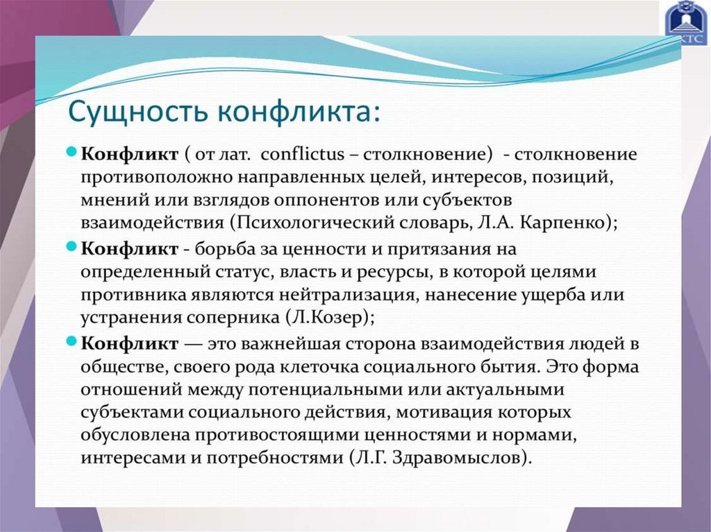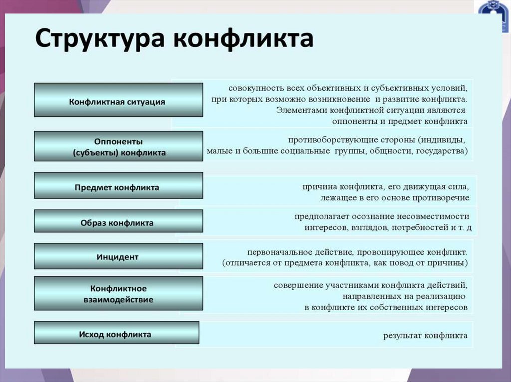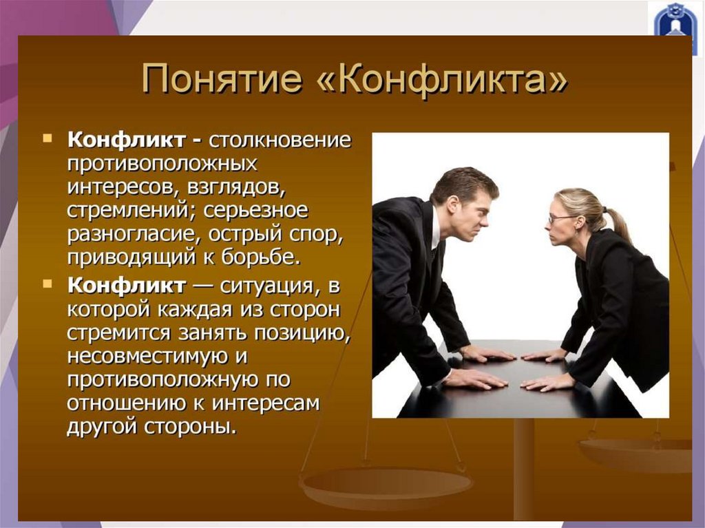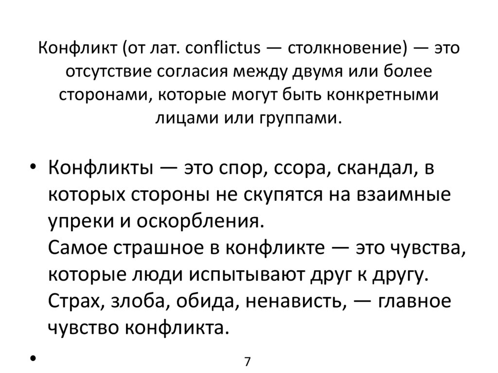7. Конфликт (от лат. conflictus — столкновение) — это отсутствие согласия между двумя или более сторонами, которые могут быть