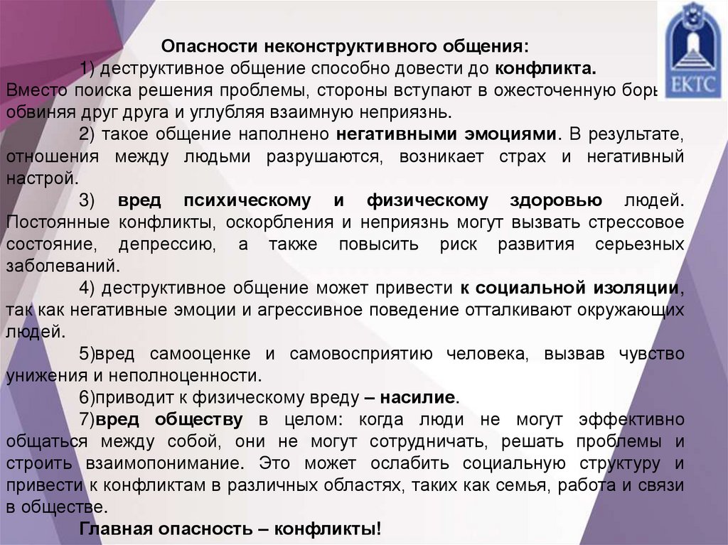 К опасным проявлениям конфликтов относятся:1). Негативное воздействие на психологическое и